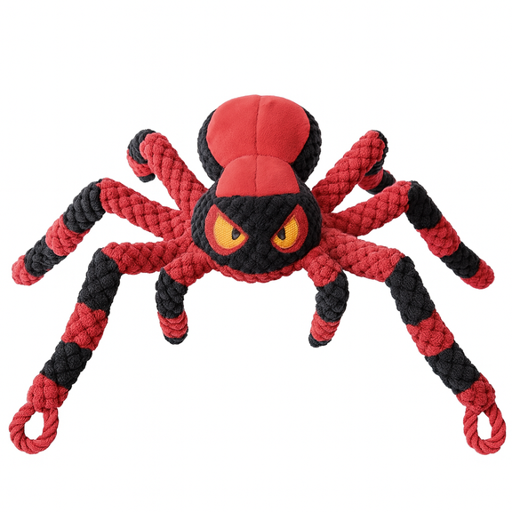Red spider-shaped dog toy for interactive and sensory play. Made from soft yet strong material to handle tug, fetch, and comfort sessions. Ideal for “Hobby for Clarity” kits promoting co-regulation and emotional calm.